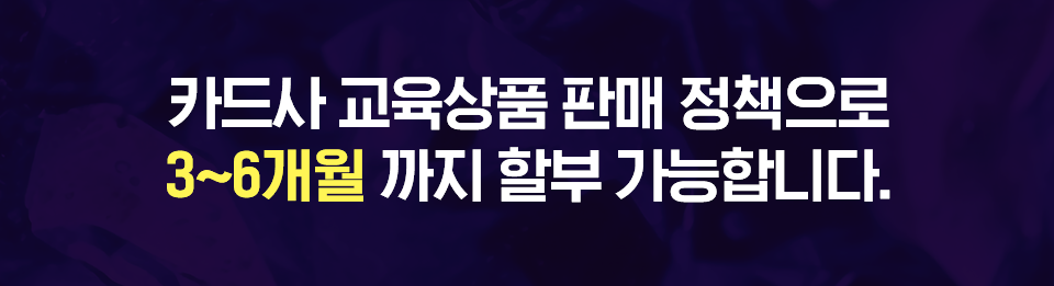삼성,신한,국민,현대,농협 3개월 무이자 / 하나 4개월 무이자 / 롯데,우리 5개월 무이자 그외 모든 카드 6개월까지 '일반'할부 가능합니다. (강의상품 특성상 PG사 규정으로 12개월 할부 불가합니다.)